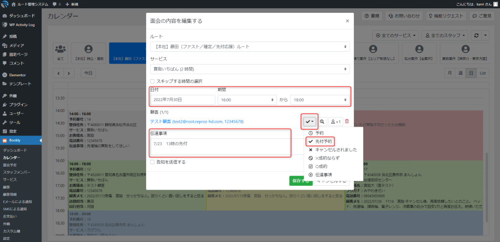 先付予約になった場合 該当の予約の編集 該当の予約をクリックし、編集します。再訪日時に変更し、ステータスを先付にします。伝達事項にいつの予定の再訪か記入し、その他仕切り書や追記事項がある場合追加して保存します。